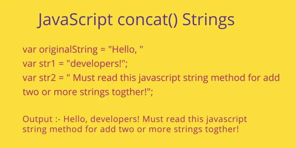 Output :- Hello, developers! Must read this javascript string method for add two or more strings together!